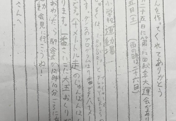 写真は、娘からもらった運動会の招待状です。一生懸命そして丁寧に書かれたメッセージに、子どもの成長を実感しました。家族の変化や成長を感じながら、地域の皆さんと共に日々を積み重ねていけることに感謝しています。