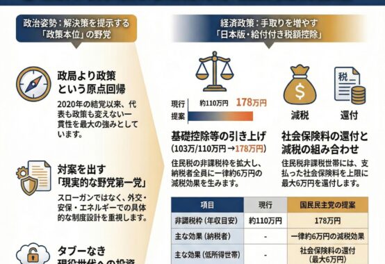 現行の働き方改革については、働いて豊かになりたいという国民の自由を奪っている。一律の残業規制や物流業界への過度な規制が、結果として人為的な労働力不足を生んでいるという見方である。トラックドライバー問題などを例に挙げ、個人の能力や意欲に応じて働ける柔軟な制度への転換を求めた。また、103万円の壁などの就労抑制策を撤廃すれば、数百万人規模の日本人労働力を掘り起こせると述べた。