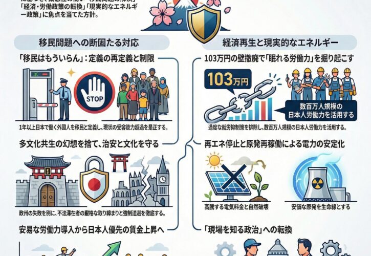 安価な外国人労働者の受け入れは、日本人の賃金上昇を抑え、経営者だけが得をする構造を生んでいると批判した。本来、人手不足は賃金を上げることで解決されるべきであり、それこそが高度経済成長期の日本が歩んだ道であるという認識である。外国人労働力に頼る前に、日本人が働きたいと思える条件を整えるべきだと主張した。